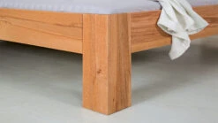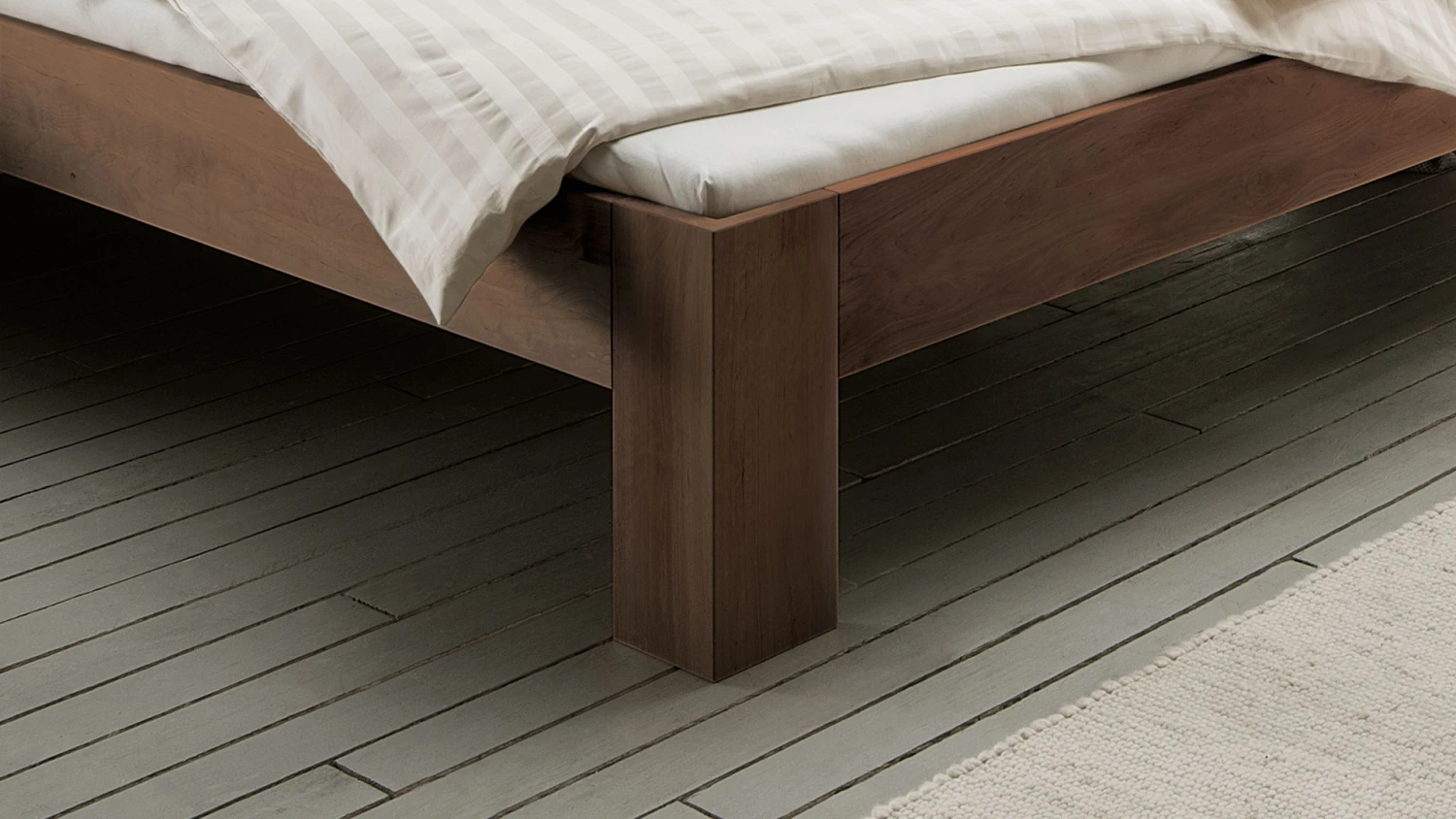 - markant breite Winkel-Füße, zum Bettrahmen gegenläufig gemasert