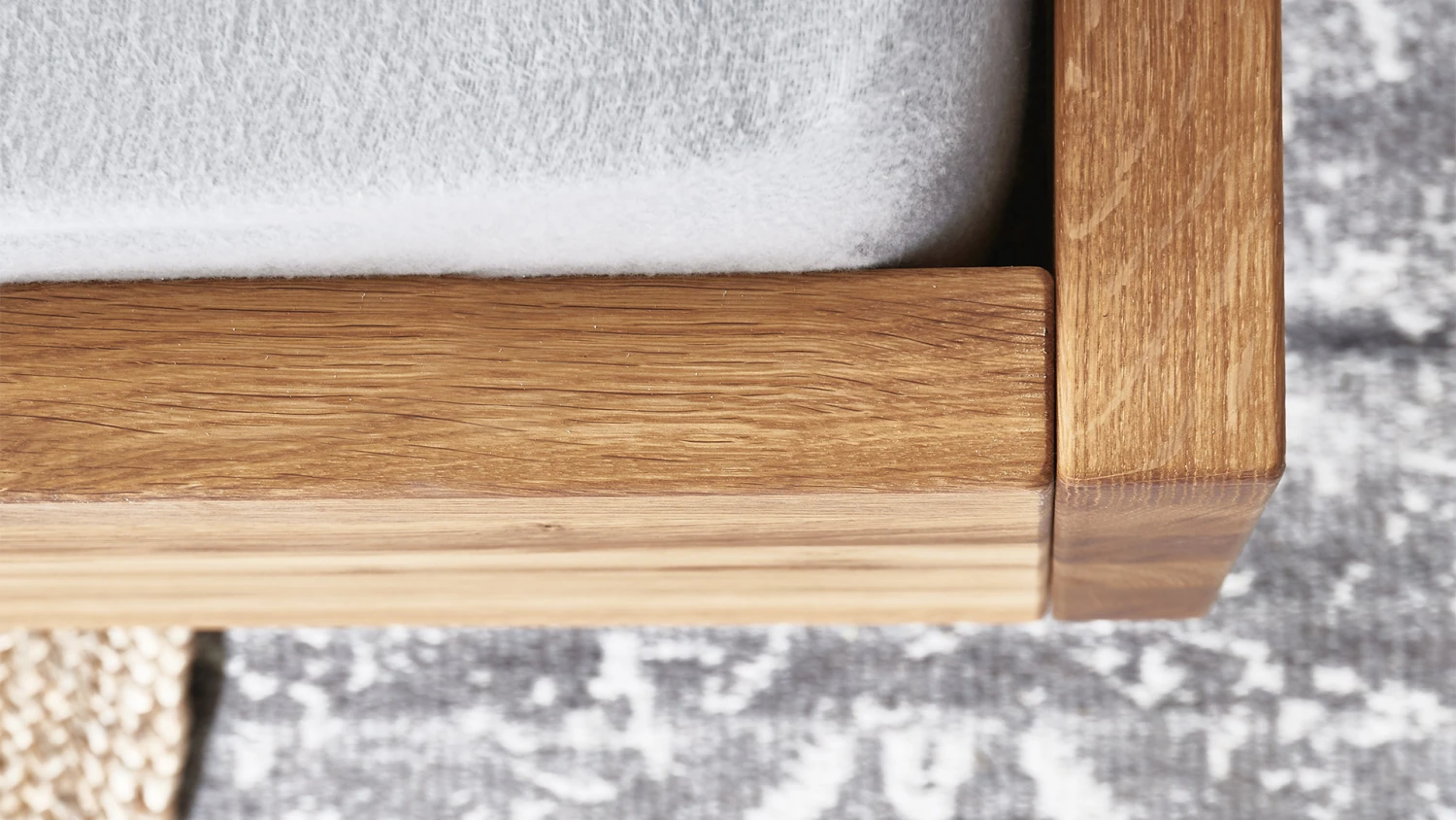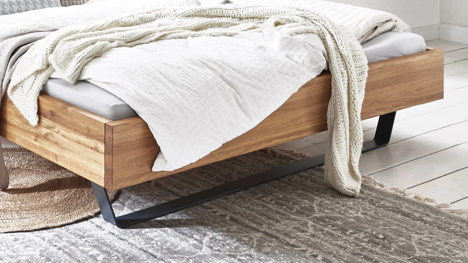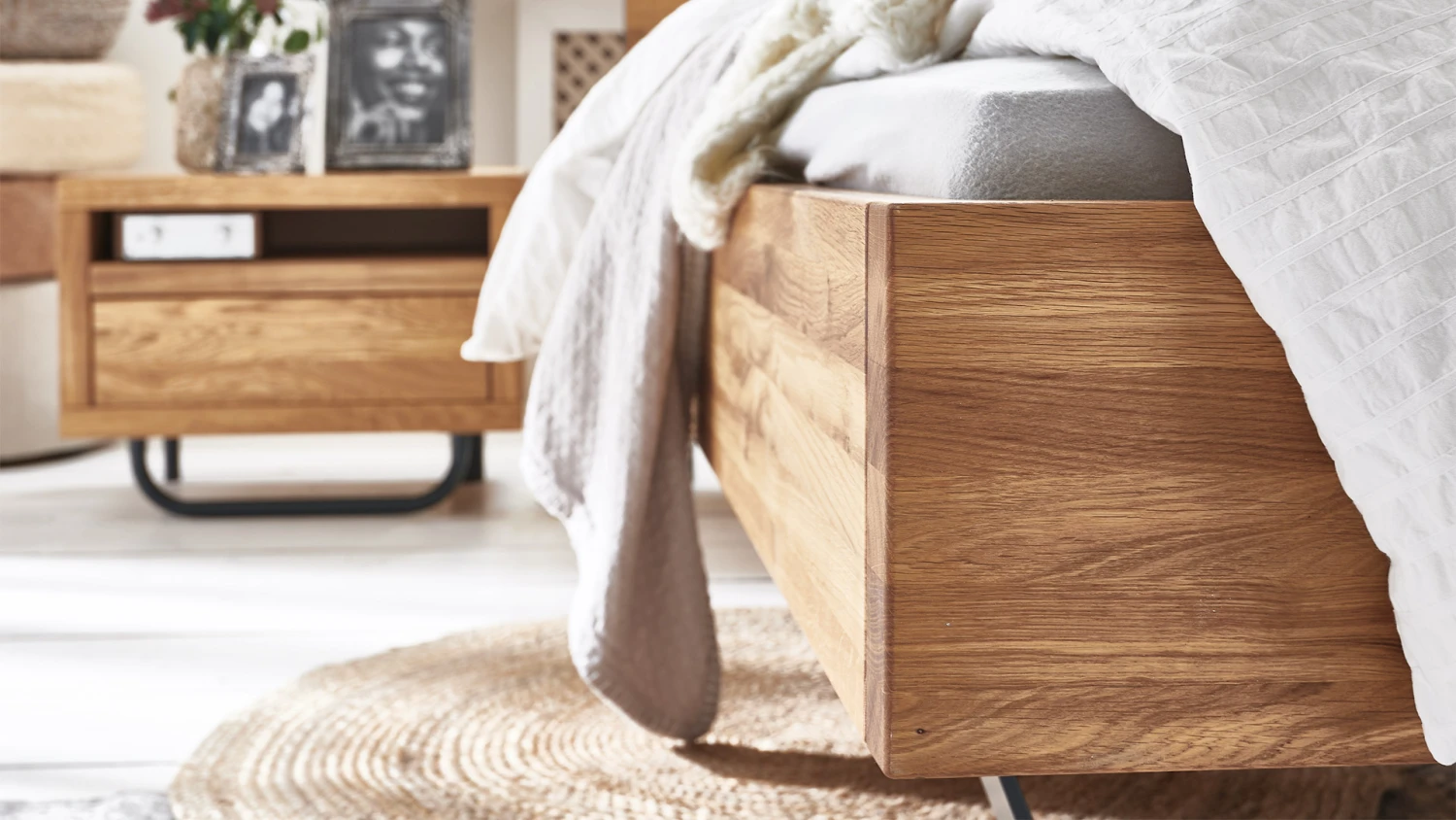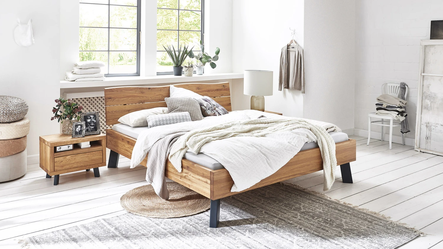 - modern auffälliges Massivholzbett mit durchgehenden Lamellen