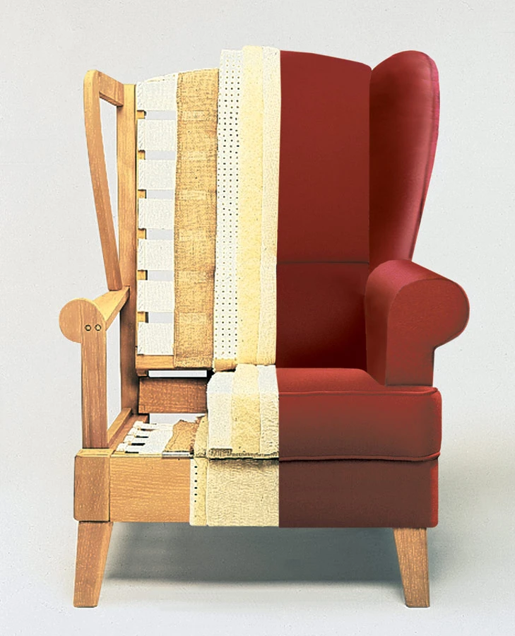 - höchster Sitzkomfort durch Unterfederung aus Wellenfedern, handgefertigtem Zylinderfederkern im Sitz und Rücken-Unterfederung mit Elastikgurten