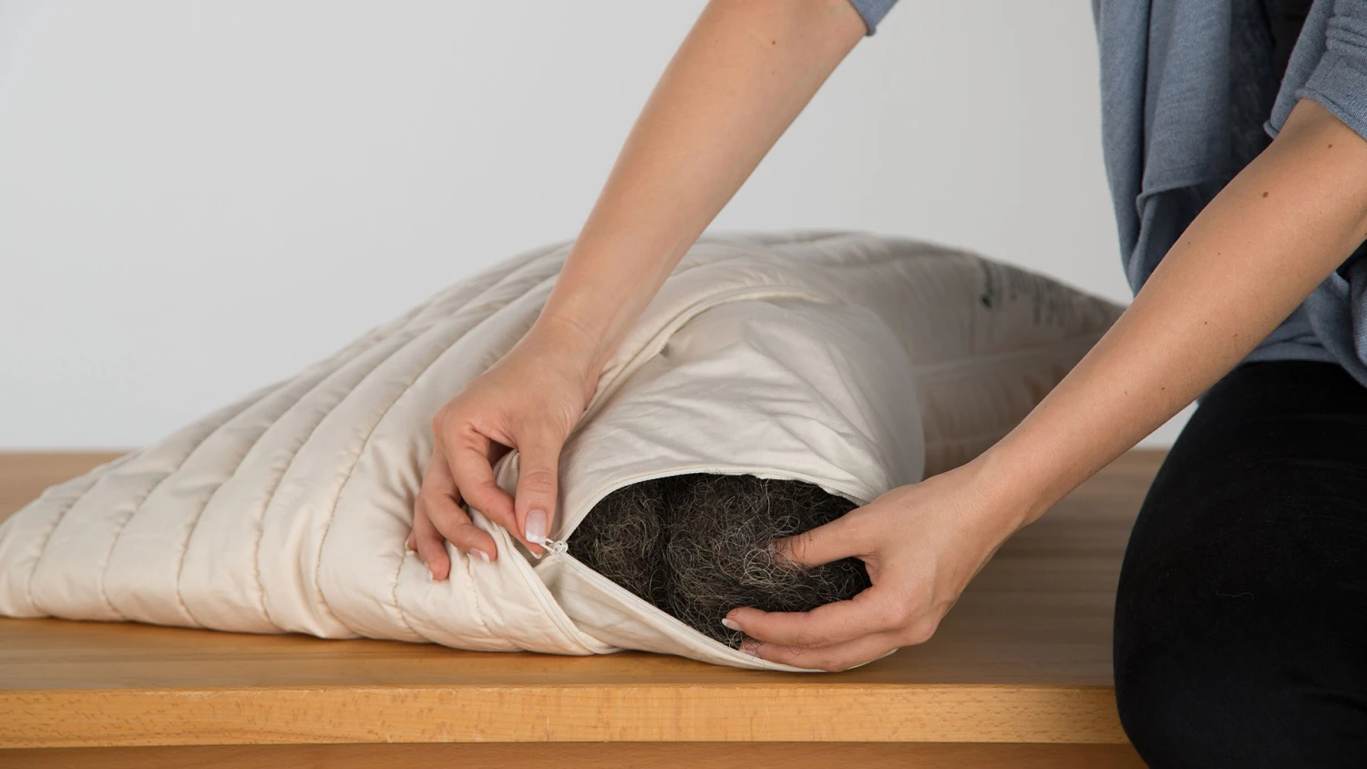 - separater Innenbezug mit Reißverschluss – erleichtert die Entnahme und Zugabe von Füllmaterial und ermöglicht das gelegentliche Auflockern der Füllung mit der Hand