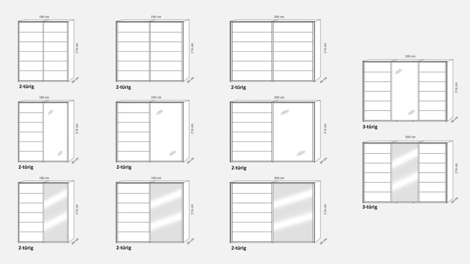 rechts und links Holztür, mittig wahlweise Spiegel- oder Weißglas-Tür