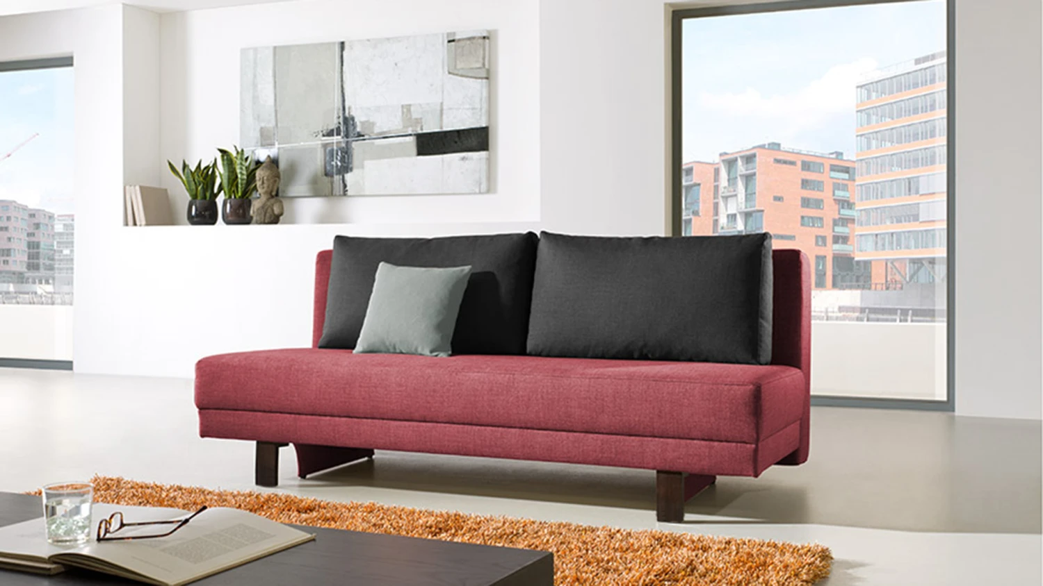 - Schlafsofa auch frei im Raum platzierbar, da RĂĽckseite komplett mit Polsterstoff bezogen