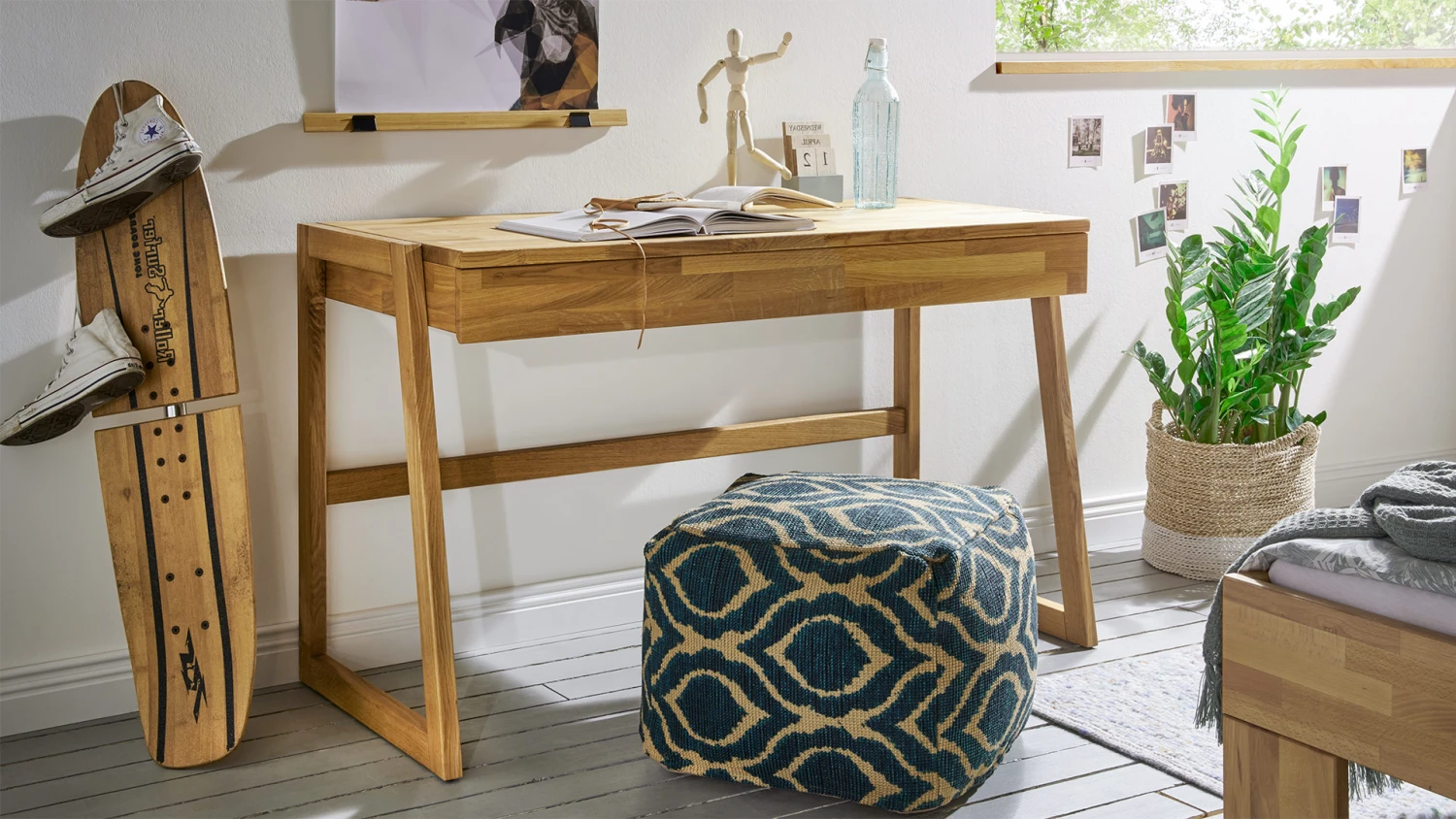 - praktischer Aufsatz erhältlich: dieser ist etwas schmäler als der Schreibtisch selbst und sorgt so für eine lockere Optik