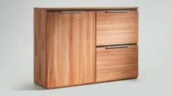 halbhoher, breiter Schuhschrank, links Türe, dahinter 2 Fachböden, rechts 2 Schuhklappen, ausgestattet mit Doppel-Schuhkörben für bis zu 16 Paar Schuhe, gegenläufige Maserung der Türe und der Klappen