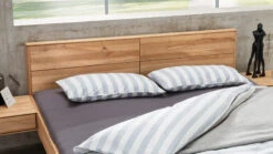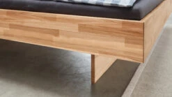 - aus massivem Kernbuchen- oder Wildeichenholz, Kopfteil aufwändig stabverleimt mit durchgehenden Lamellen, Rahmen und Schwebe-Fußelement parkettverleimt