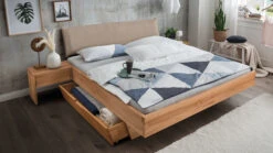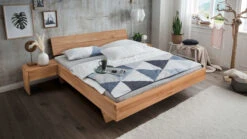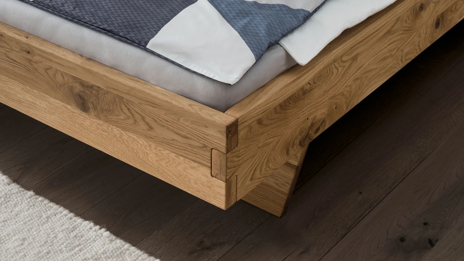 groĂźflächiges, rechteckiges Kopfteil, das die Eigenarten der einzelnen Hölzer gekonnt präsentiert, bequem geneigt - Kopfteil „zweigeteilt“