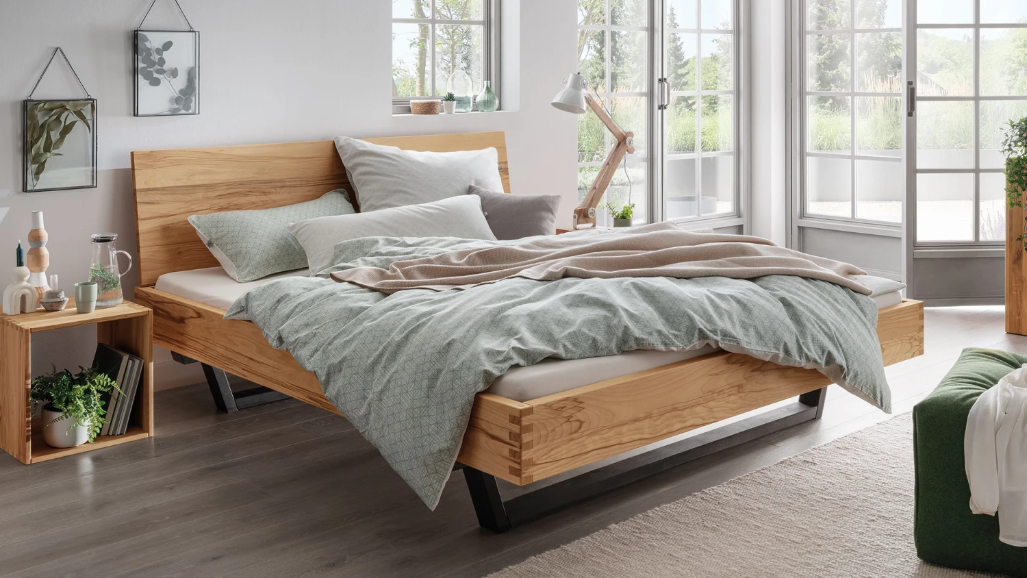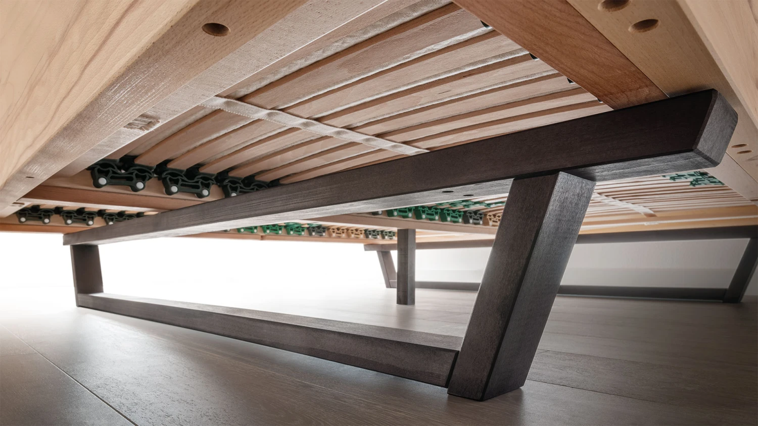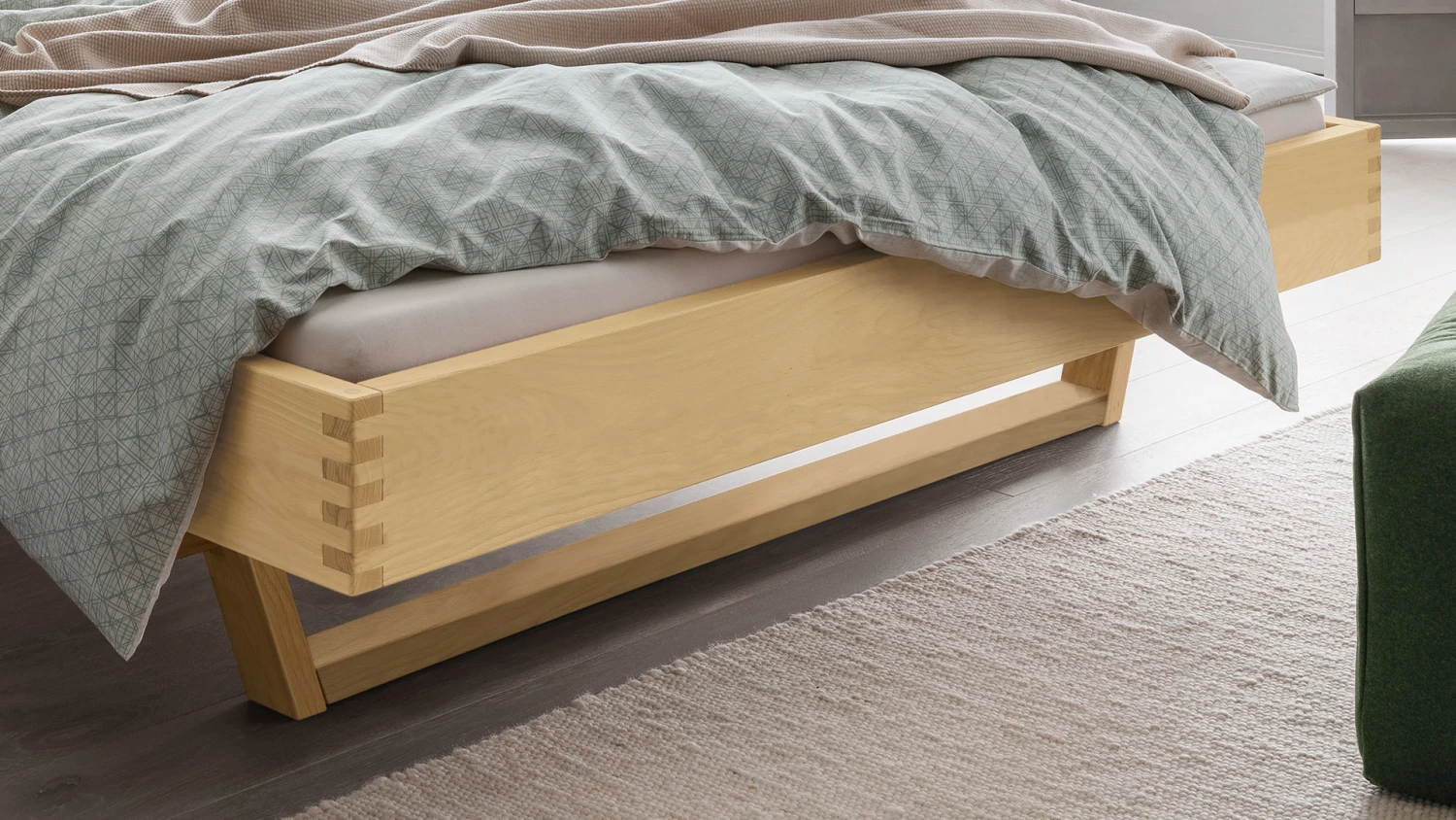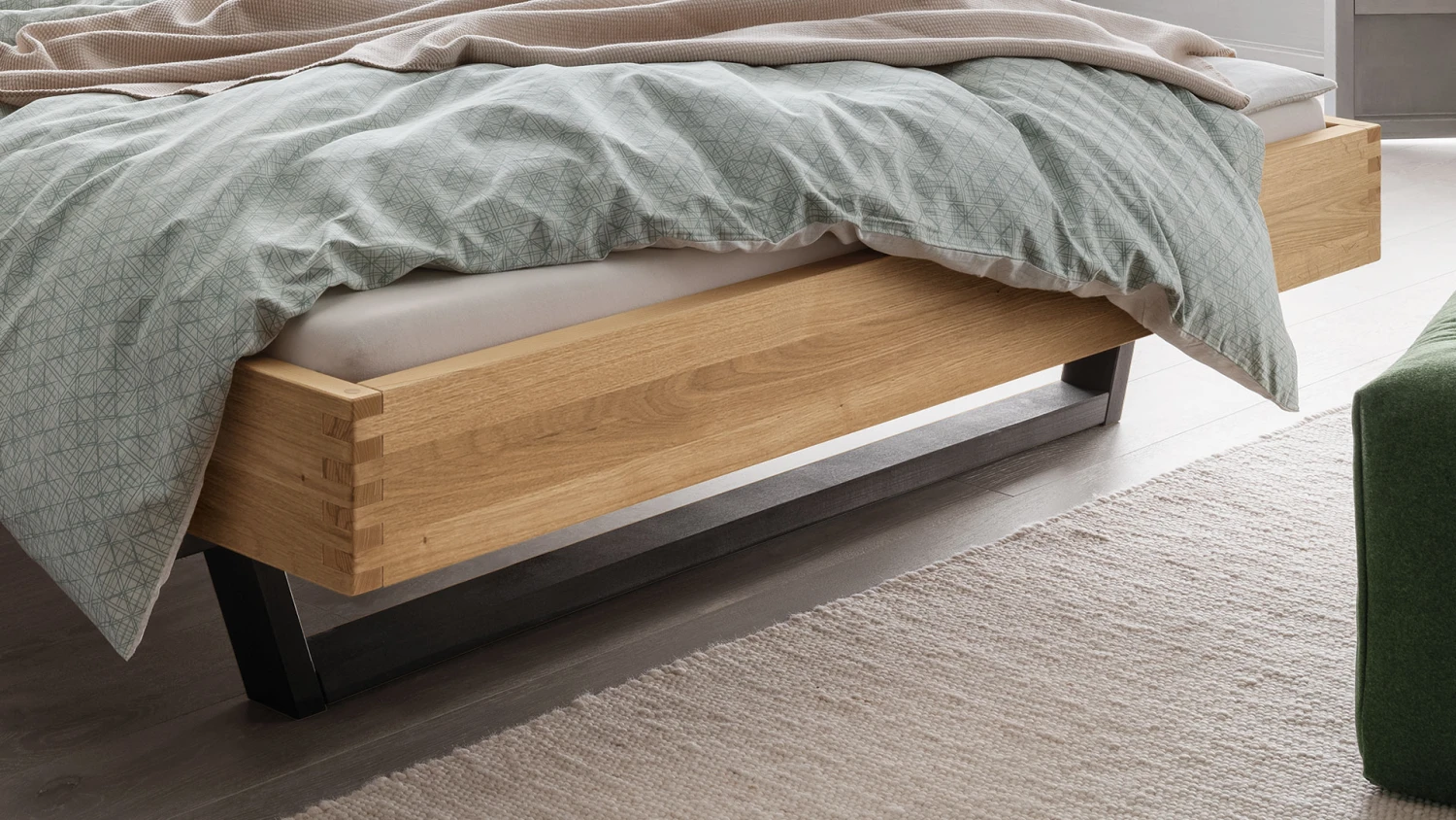 - Modernes Schwebebett mit wahlweise schwarzen Kufen aus gebeizter Buche oder Holzkufen passend zum Gestell