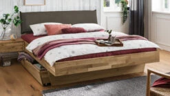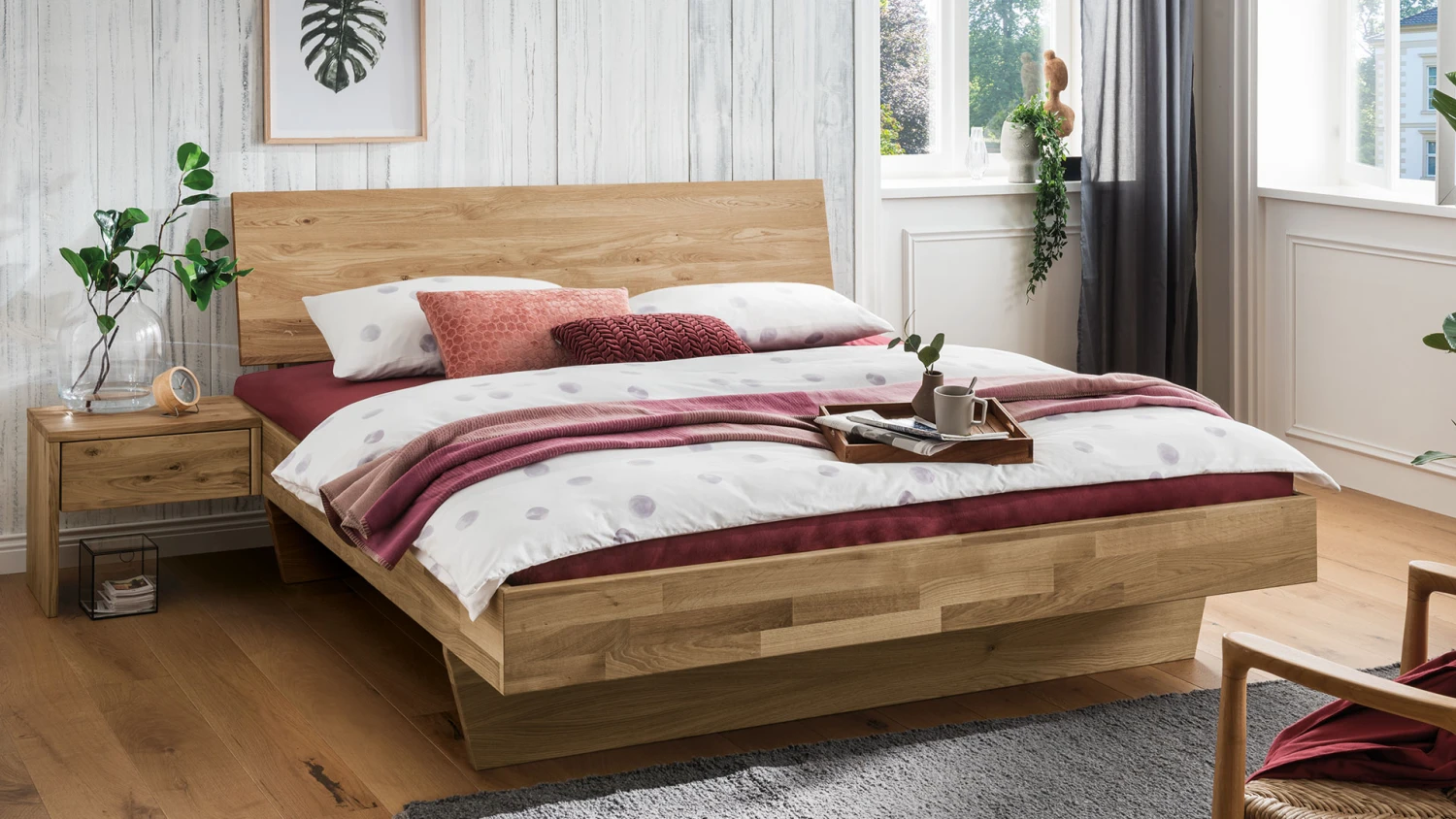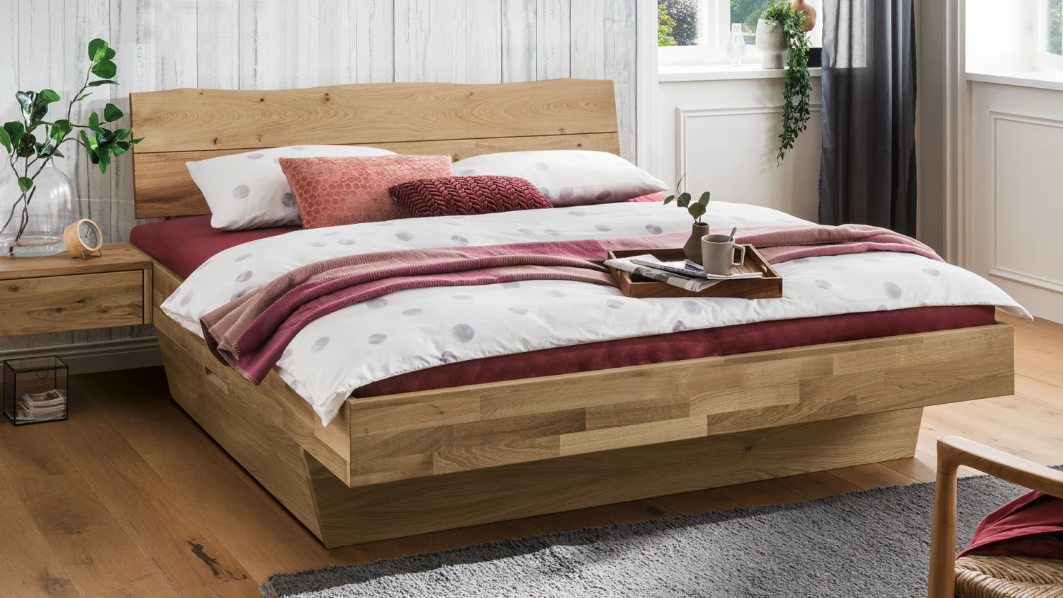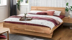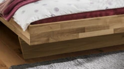 - aus massivem Kernbuchen- oder Wildeichenholz, Kopfteil aufwändig stabverleimt mit durchgehenden Lamellen, Schmuckrahmen und Schwebe-Fußelement parkettverleimt