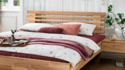 groĂźflächiges, rechteckiges Kopfteil, das die Eigenarten der einzelnen Hölzer gekonnt präsentiert, bequem geneigt - Kopfteil „zweigeteilt“