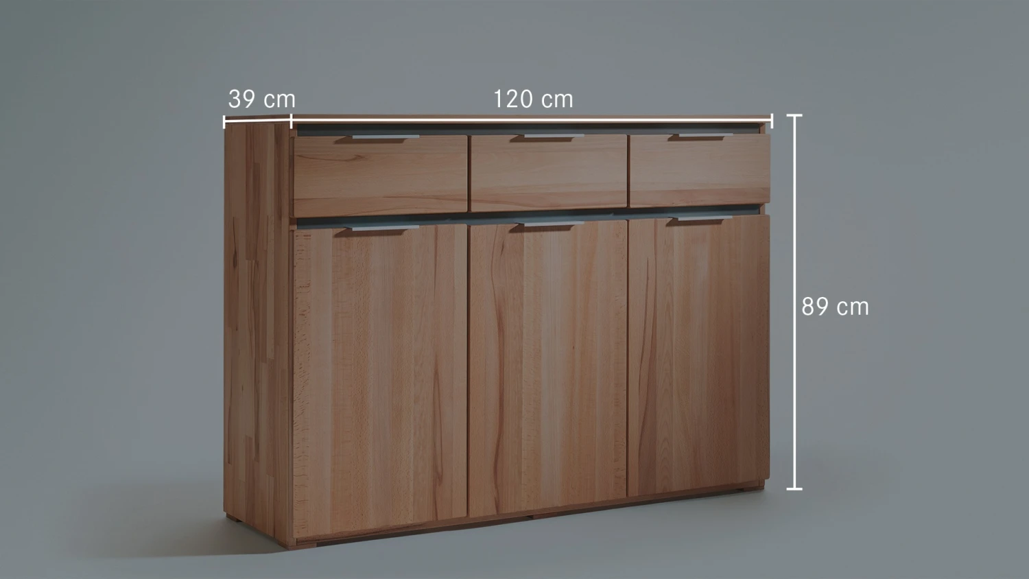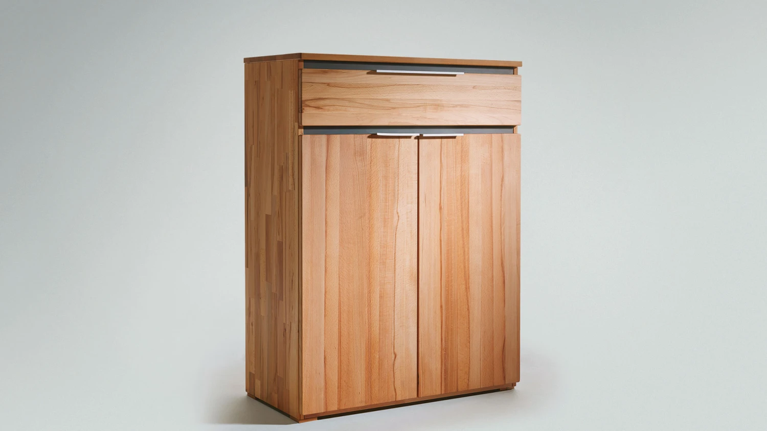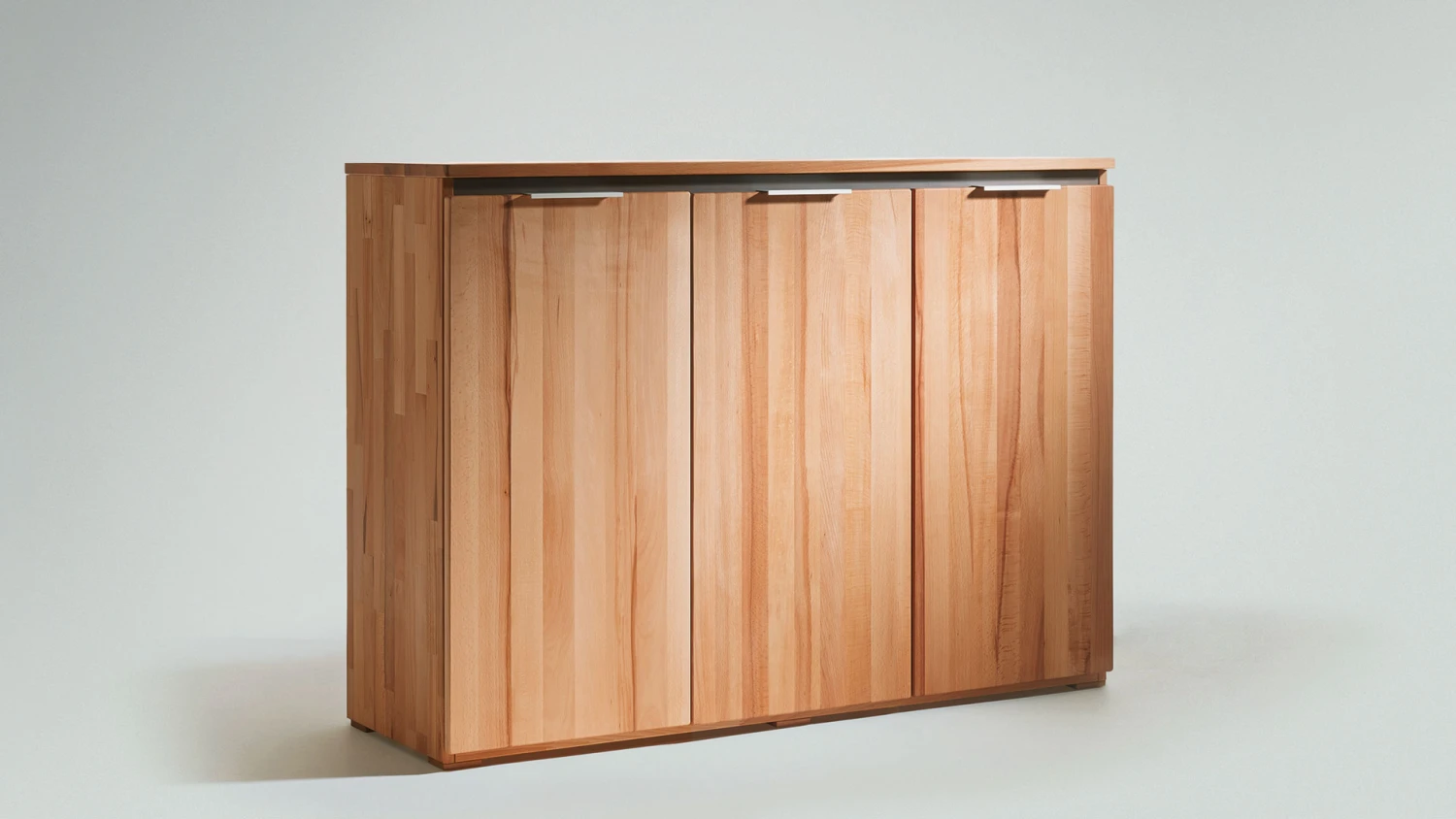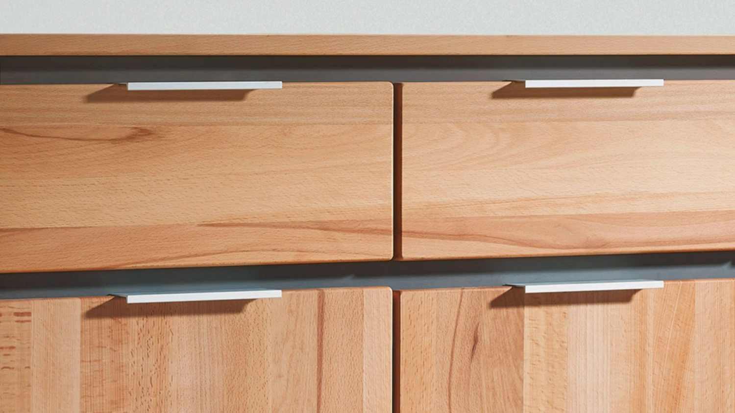 - geradlinige, stabverleimte Fronten, die der beschwingt gemaserten Kernbuche die perfekte BĂĽhne bieten