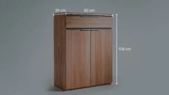 mit 1 breiten Schublade, darunter 2 Türen, dahinter 3 breite Fachböden