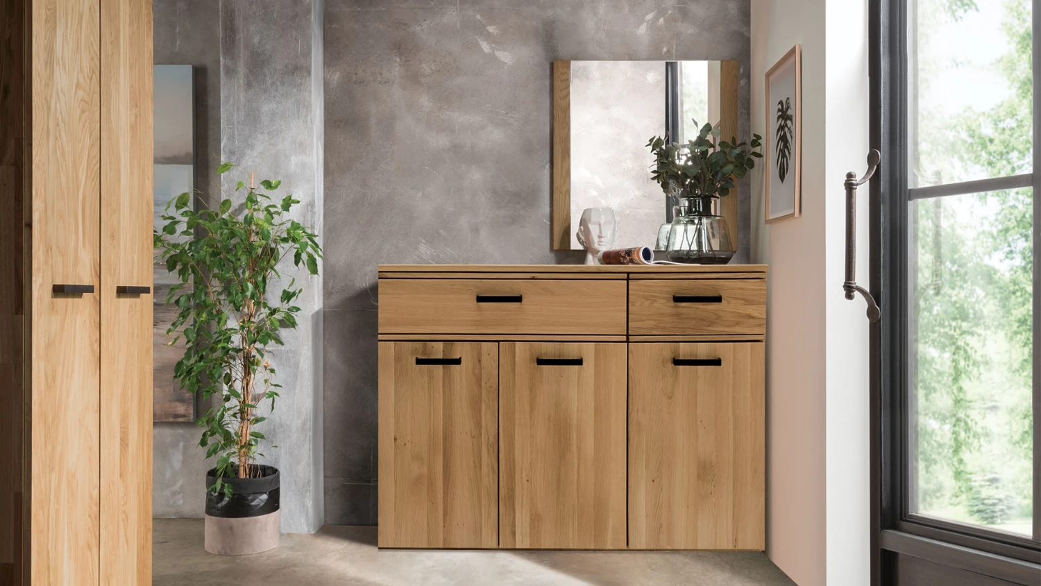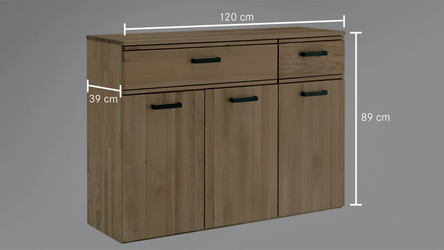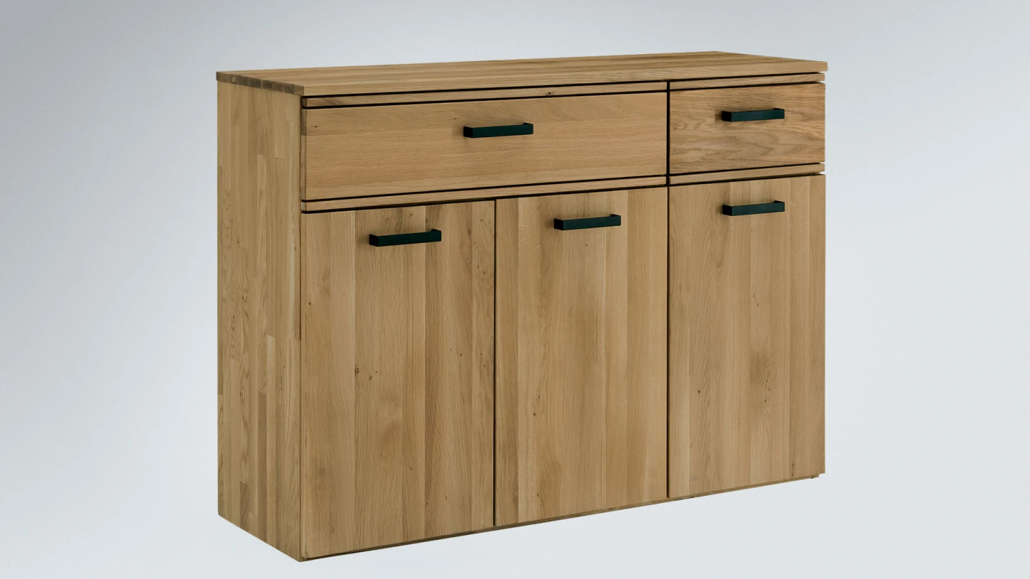 - aus massivem Wildeichenholz, Fronten aufwändig stabverleimt mit durchgehenden Lamellen, Korpus parkettverleimt