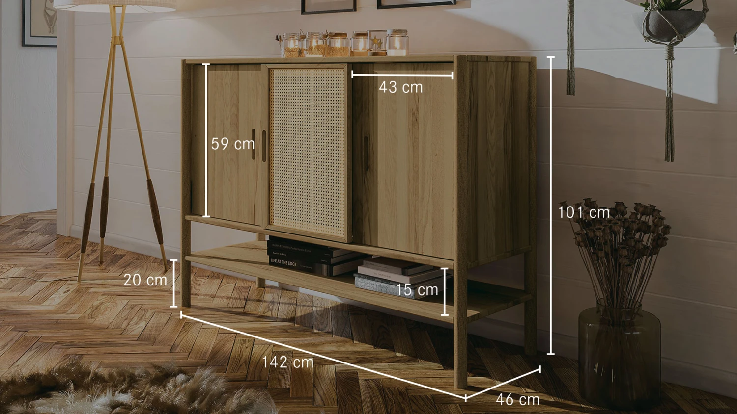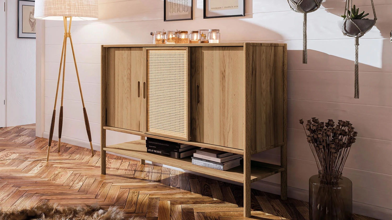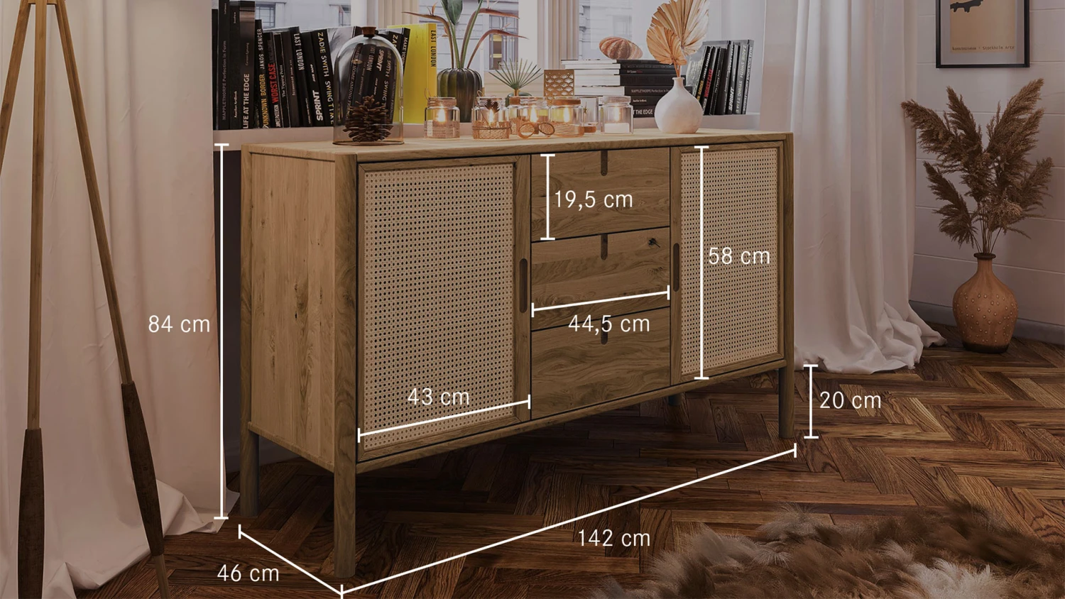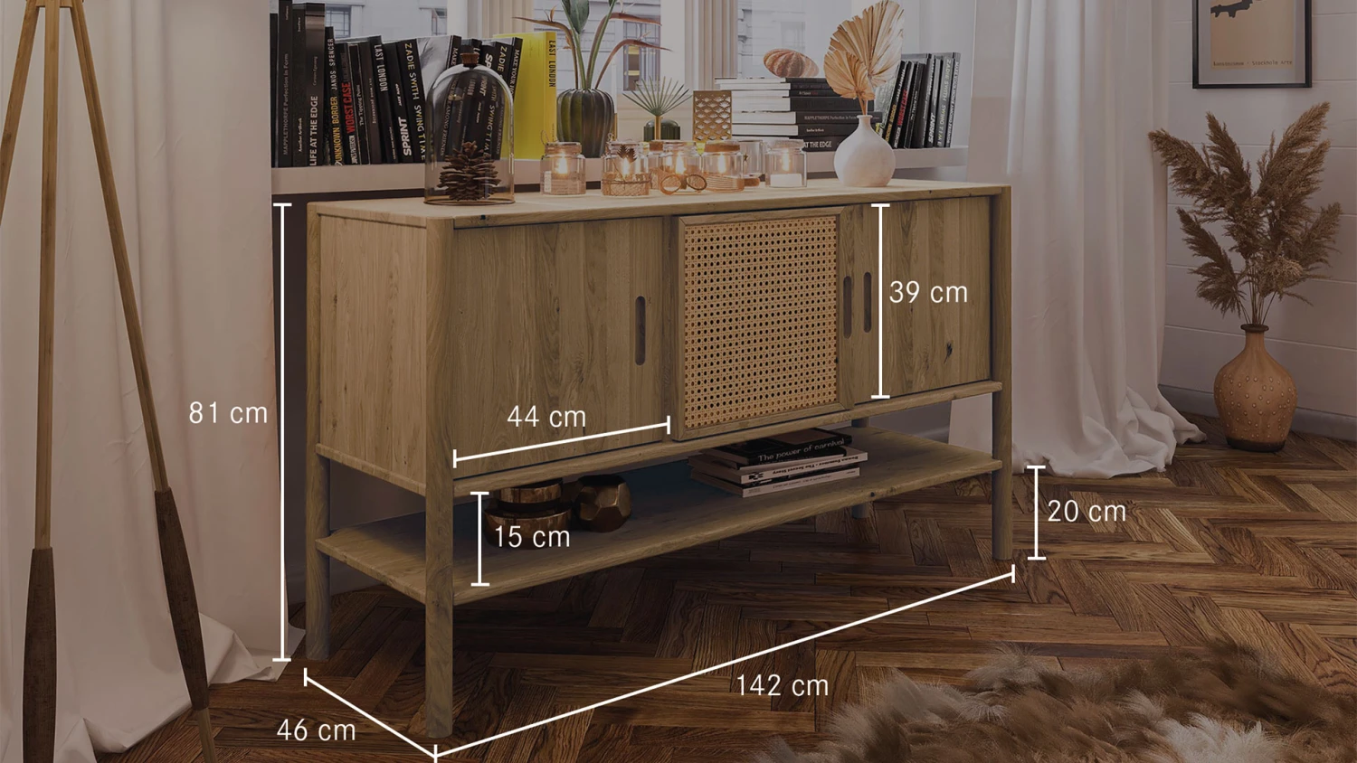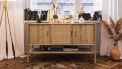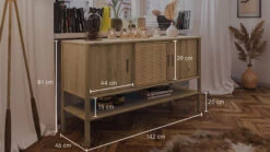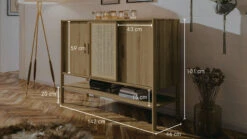 3 Schiebetüren, 1 davon mit Wiener Geflecht, dahinter 3 Fächer mit jeweils 1 Fachboden, darunter breites offenes Regal
