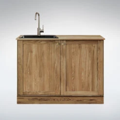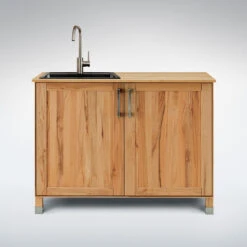 - überstehende Arbeitsplatte aus edlem Massivholz – Aussparung für Spüle muss individuell passend vorgenommen werden