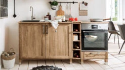 - Die Anbringung einer durchgängigen Arbeitsplatte z.B. aus Holz oder Naturstein ist mit etwas handwerklichem Geschick problemlos möglich, weil die Deckplatten der Küchen-Unterschränke nur geschraubt und nicht fest verleimt sind.