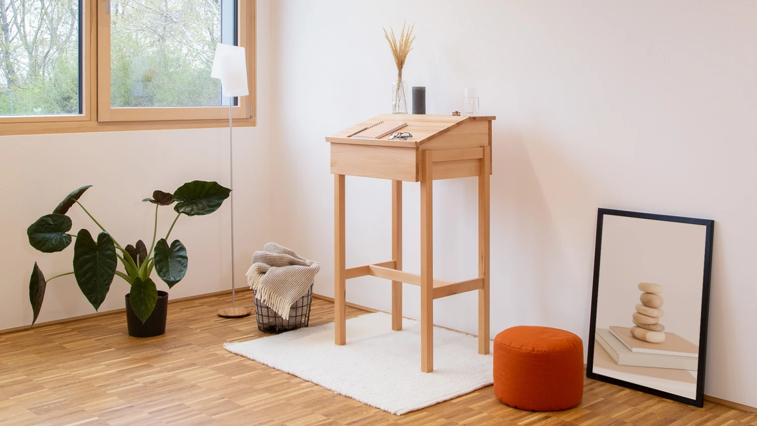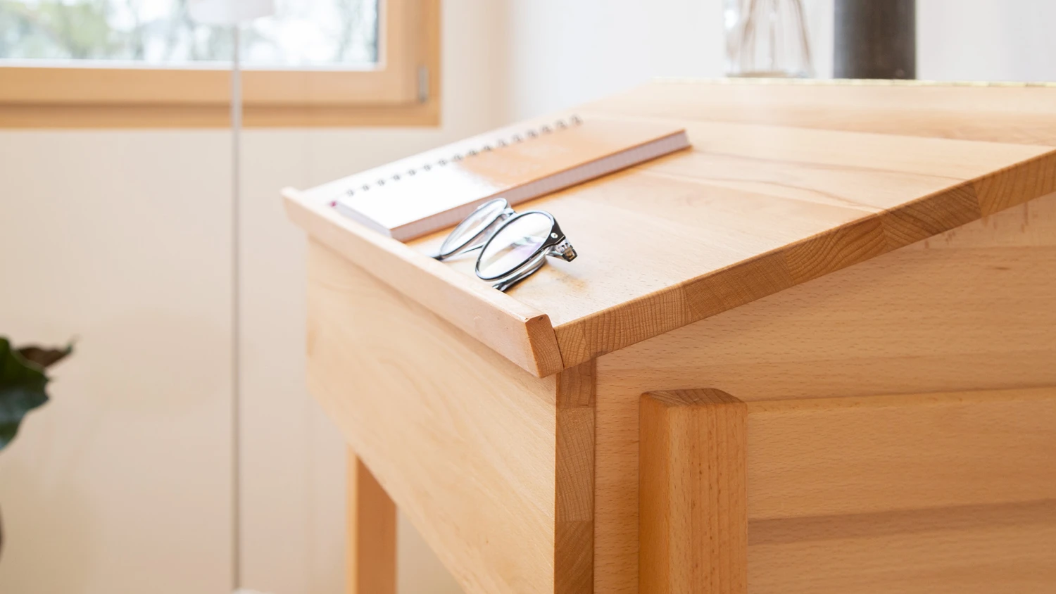 - Stehpult mit 1 geraden Ablage und 1 schrägen Arbeitsfläche mit Abrutschsicherung, darunter 1 Ablagefach