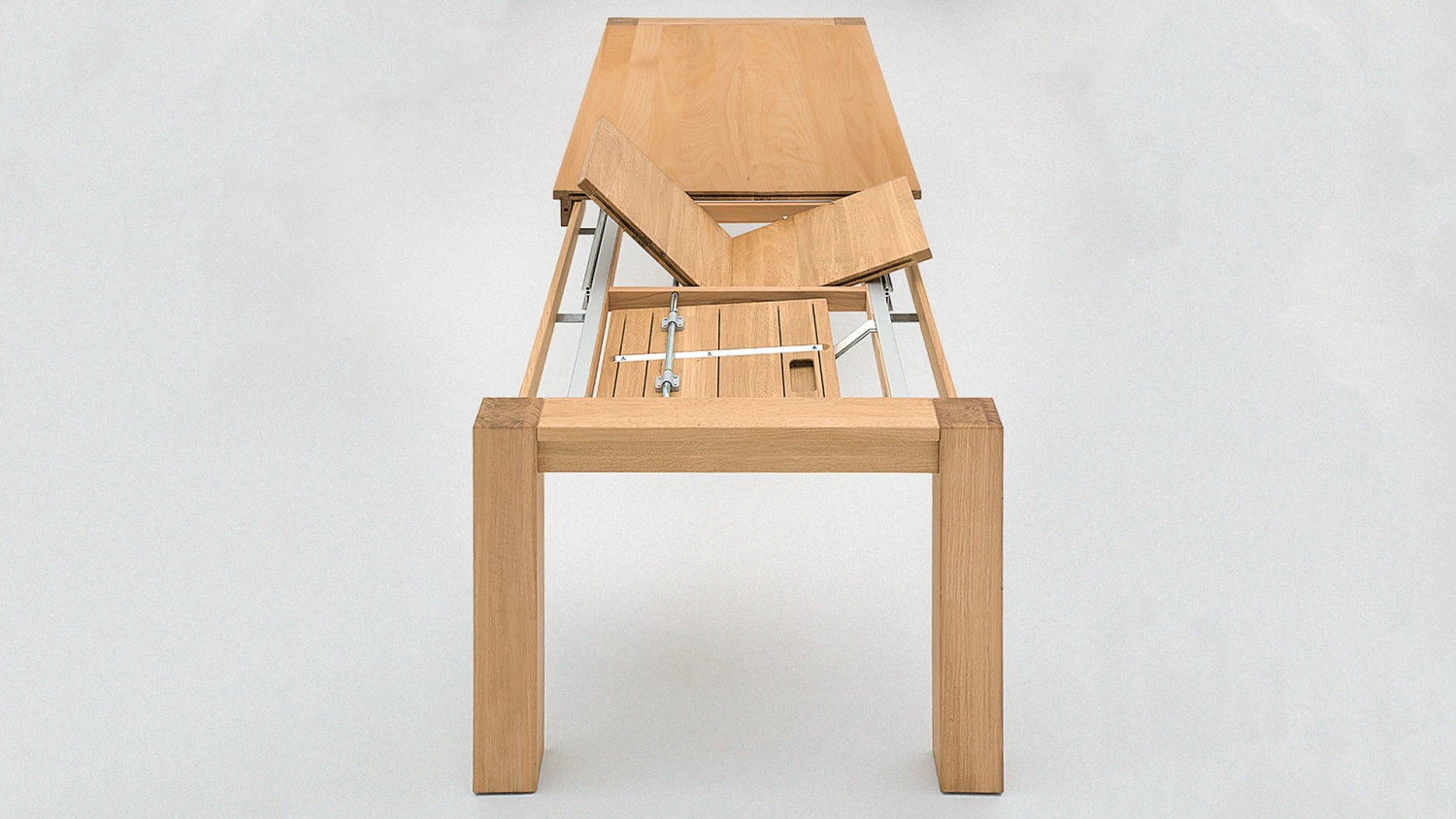 - optional auch mit Auszugs-System (Gestellauszug mit Klapp-Einlagen) in 2 Längen erhältlich, die Tischbeine sind dann auf der Auszugs-Seite mit praktischen Rollen ausgestattet – beidseitige Anbringung des Auszugs oder nachträgliche Montage aus konstruktions-technischen Gründen nicht möglich