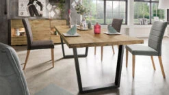 - die Kombination von zwei Holzarten ist beeindruckend – Längsseiten der Tischplatte mit etwas zurückhaltender Maserung, damit die markant gemusterte Tischmitte voll zur Geltung kommt