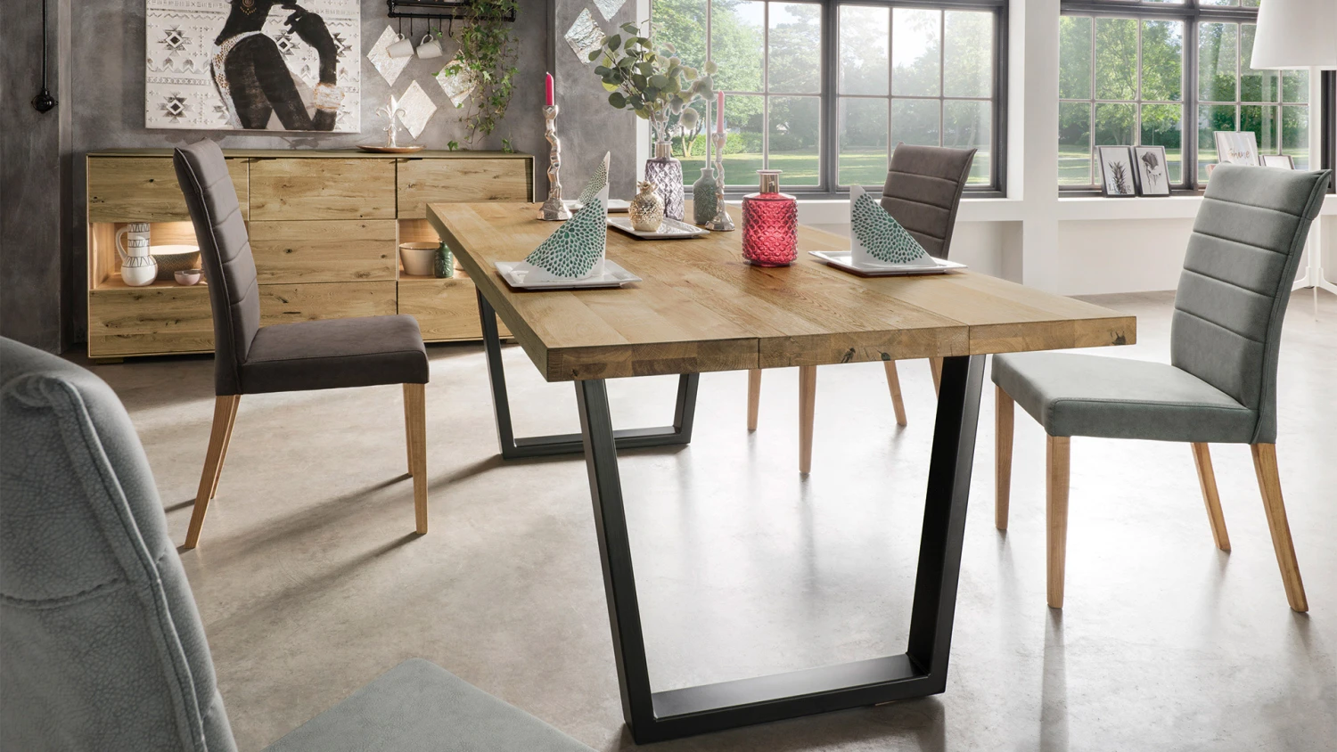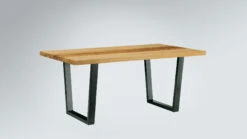 - Tischmitte aus massivem Wildkernbuchen- oder Wildeichenholz, aufwändig stabverleimt mit durchgehenden Lamellen