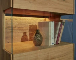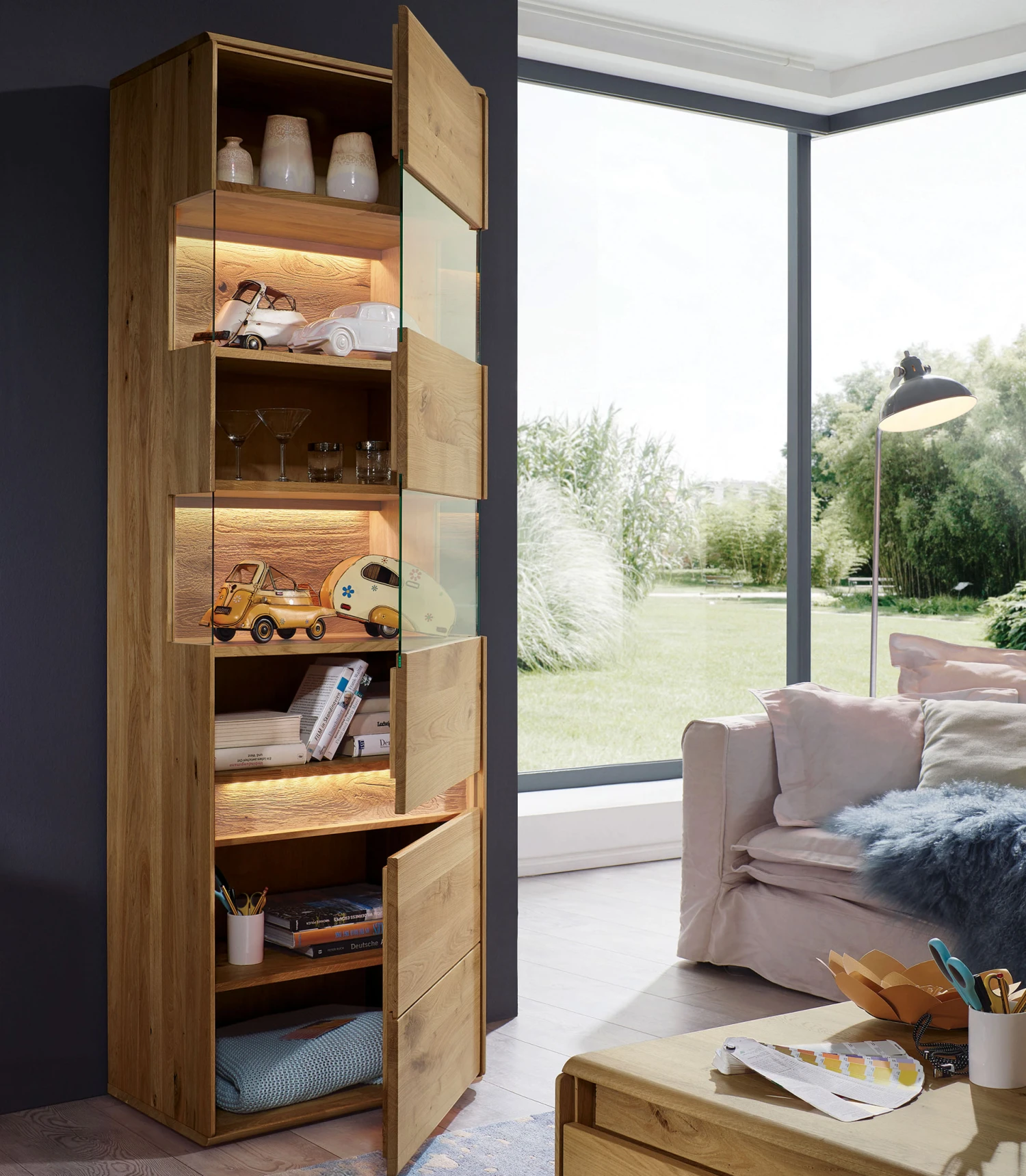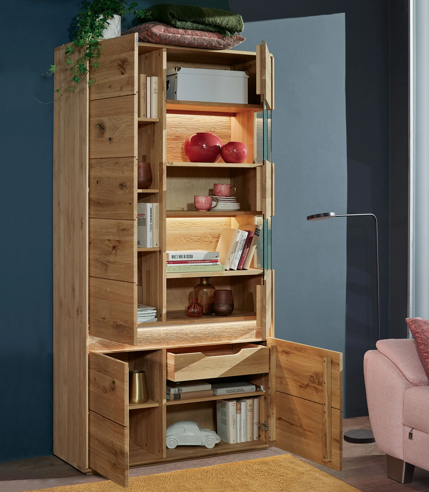 links 1 Holztür mit 2 Glaseinsätzen, dahinter 4 breite Einlegeböden, darunter 1 Holztür, dahinter 1 breiter Einlegeboden;