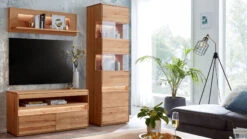 rechts 1 Holztür mit 2 Glaseinsätzen, dahinter 4 breite Einlegeböden, darunter 1 Holztür, dahinter 1 breiter Einlegeboden;
