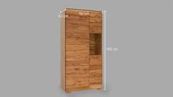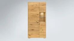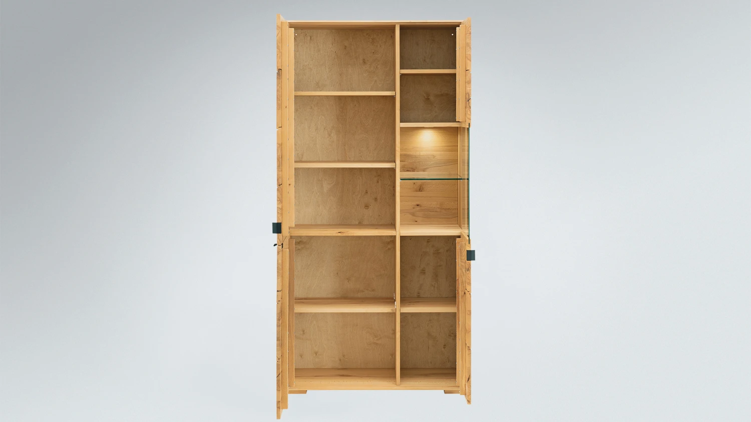- links 2 Holztüren, dahinter 5 Holzfachböden – Türen links angeschlagen, rechts 1 Holztüre, dahinter 5 Holzfachböden und 1 Glasboden – Türe rechts angeschlagen
