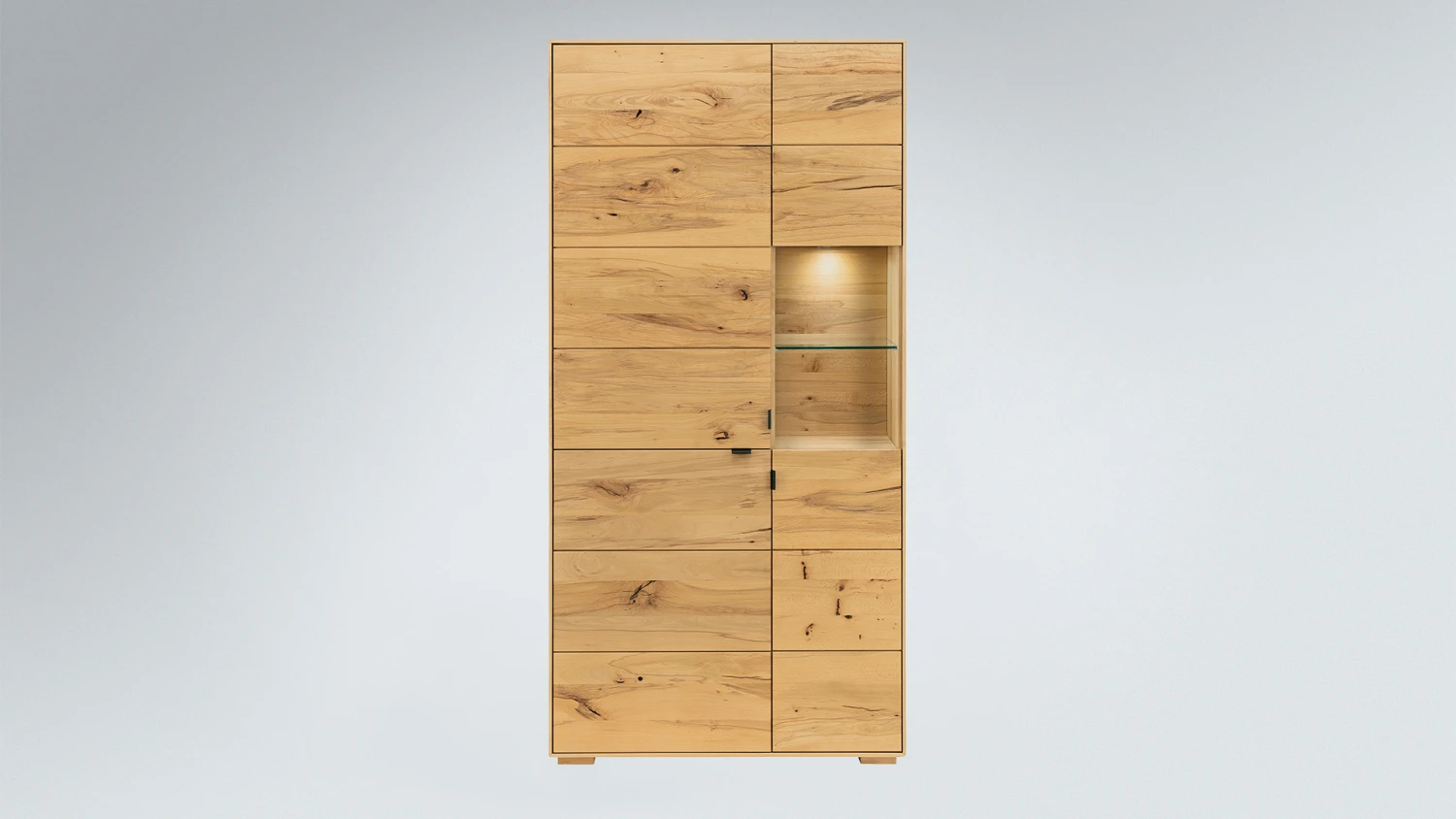 - Fronten aus massivem Wildkernbuchen- oder Wildeichenholz, aufwändig stabverleimt mit durchgehenden Lamellen