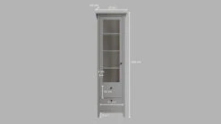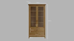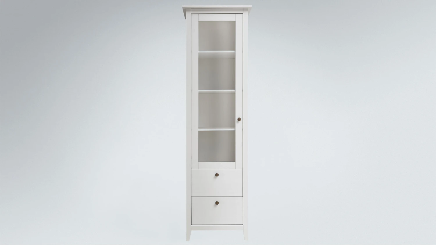 schmale Vitrine mit 1 GlastĂĽr – TĂĽranschlag beidseitig möglich, dahinter 3 Holz-Fachböden; darunter 2 Schubladen