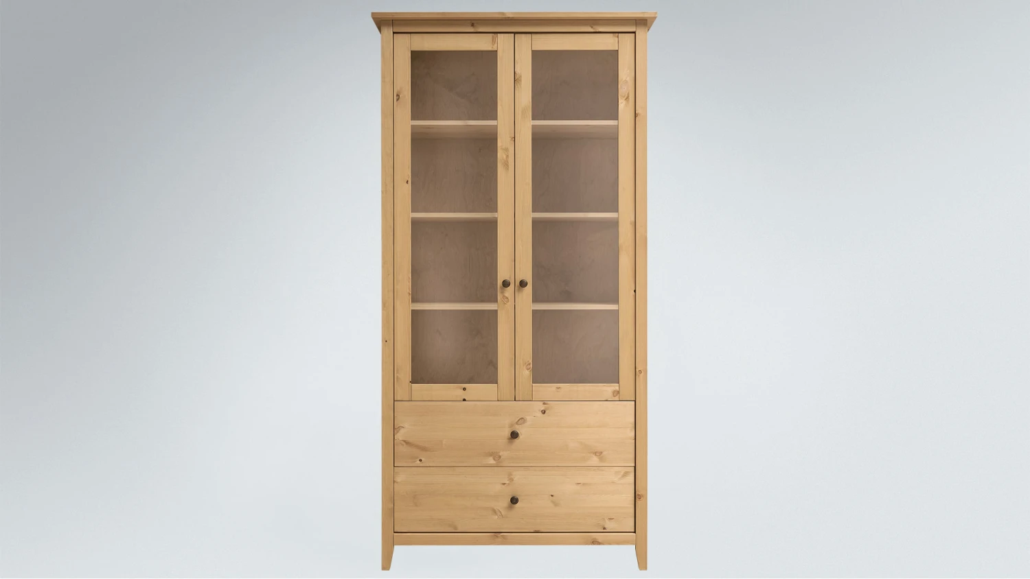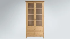 breite Vitrine mit 2 Glastüren, dahinter 3 Holz-Fachböden; darunter 2 Schubladen