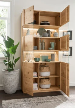 rechts 1 breite Holztüre mit 2 Glaseinsätzen mittig und oben, dahinter 5 breite Holzfachböden, davon der untere höhenverstellbar
