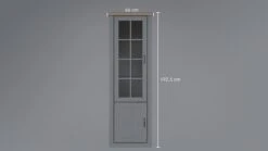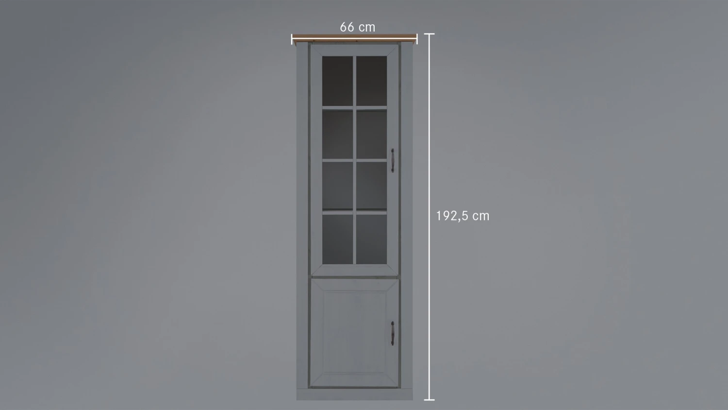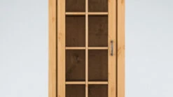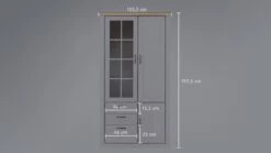 mit 1 hohen HolztĂĽr mit Glaseinsatz oben, dahinter 3 Fachböden, darunter 1 niedrige HolztĂĽr, dahinter 1 Fachboden – Anschlag kann wahlweise links oder rechts montiert werden