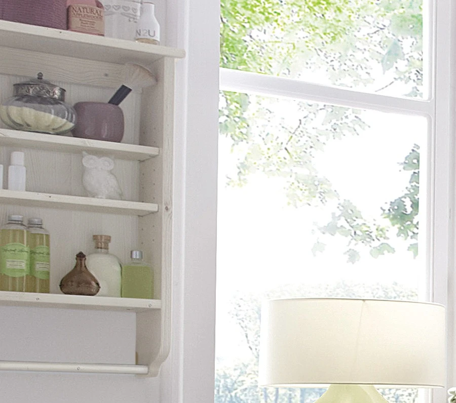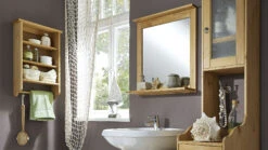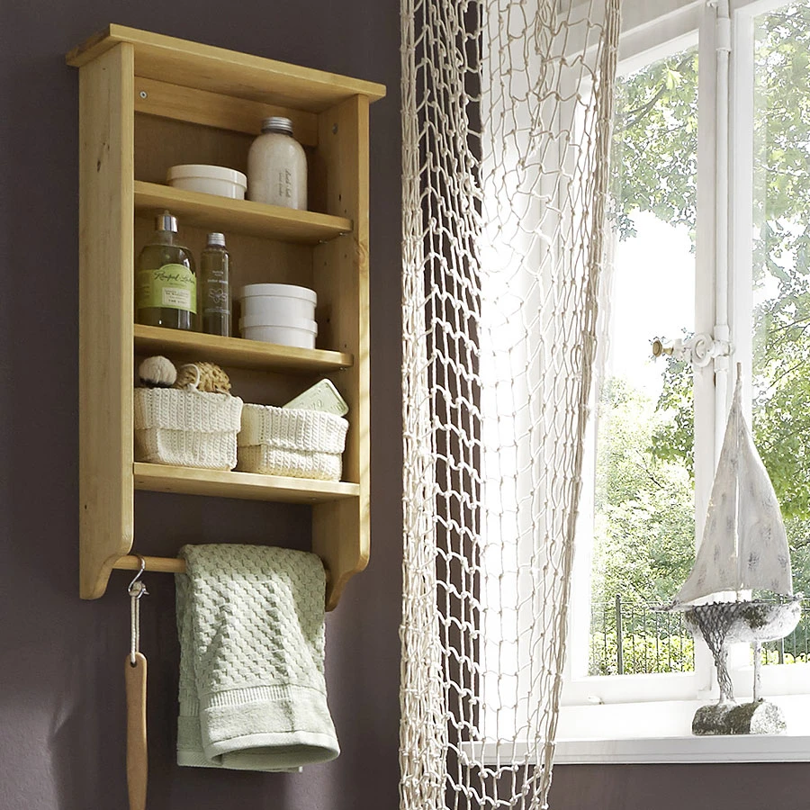 - 2 Fachböden, Regalteil mit Rückwand und darunter eine Halterung für Badutensilien oder kleine Handtücher