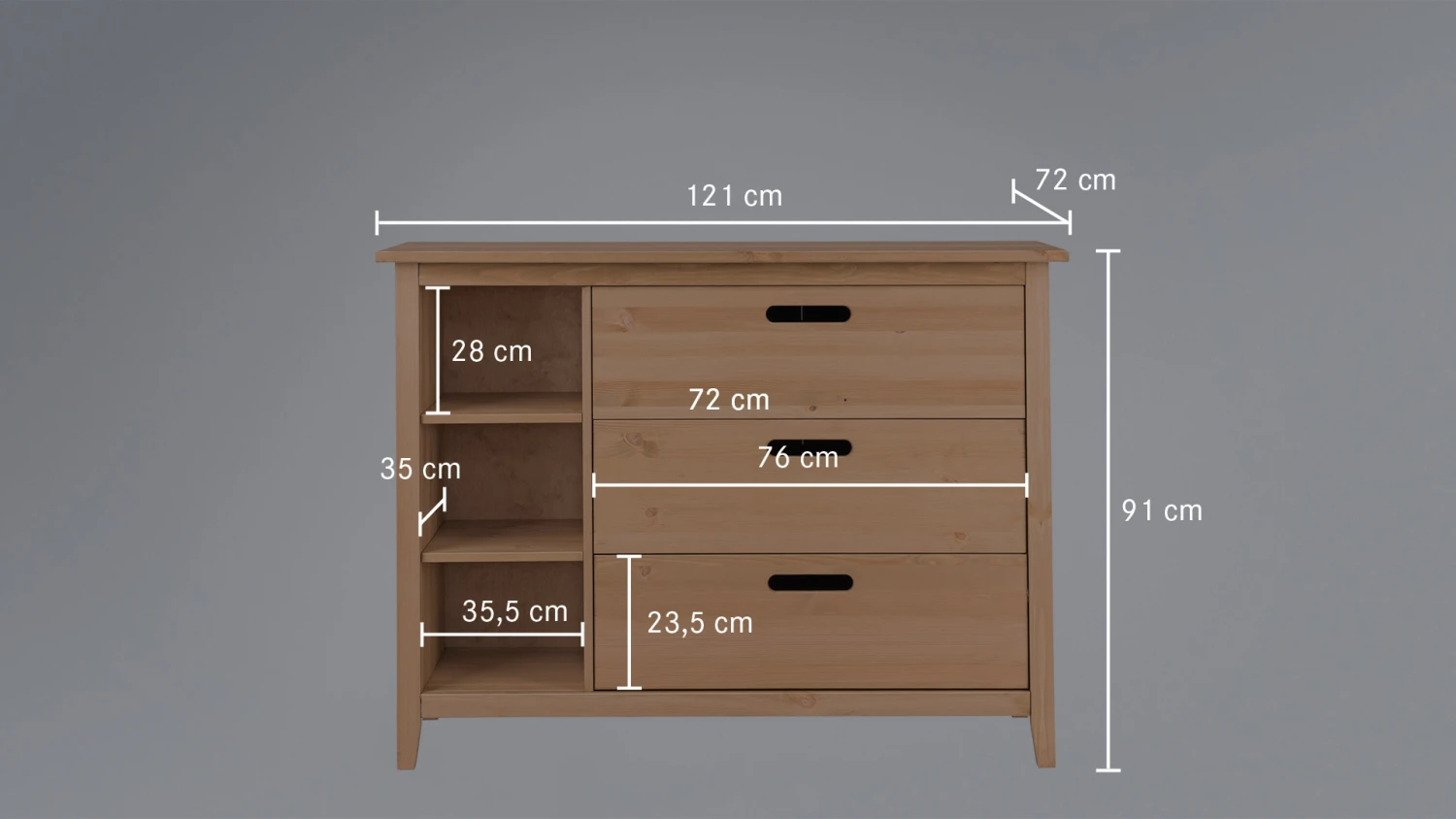 3 schmale offene Fächer, daneben 3 breite Schubladen