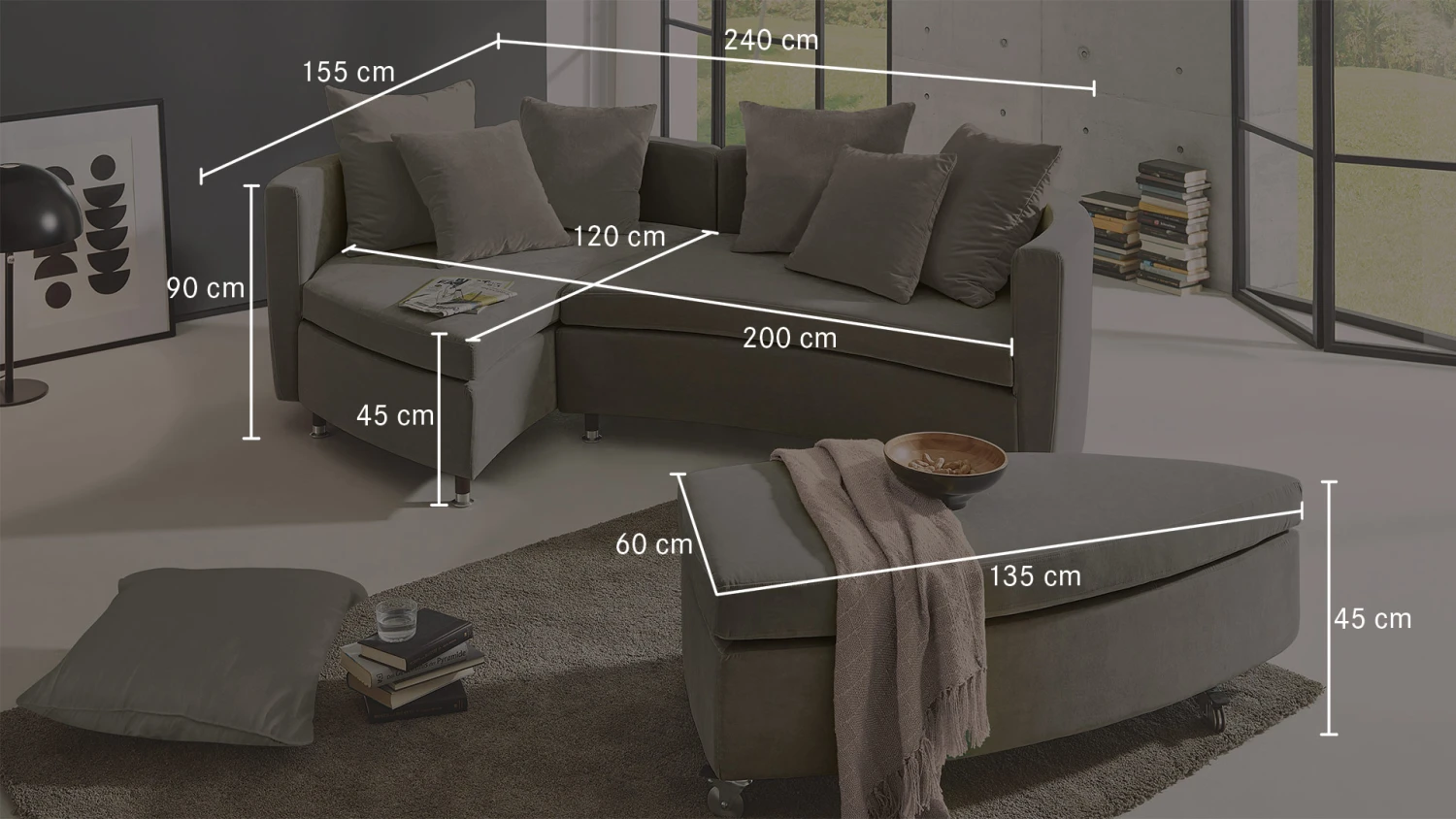 - Wohninsel auch frei im Raum platzierbar, da RĂĽckseite komplett mit Polsterstoff bezogen
